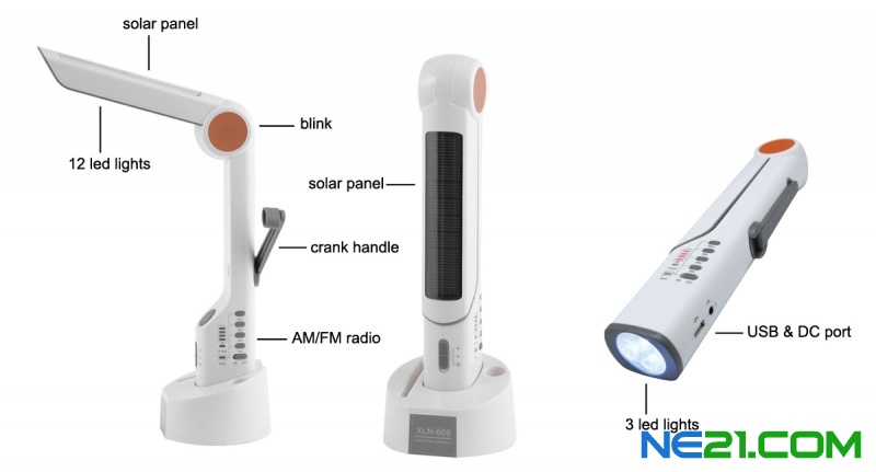 產品介紹: 1.太陽能充電. 2.手搖發電、手搖可給手機及數碼產品充電 3.臺燈. 4.AM/FM. 5.閃燈警報.6.三顆超亮LED照明. 7.電量顯示功能. 產品規格: 1.材質:ABS、PS 2.LED燈的規格:¢5; 15個LED、LED的亮度:2050MCD; 3.電池類型:聚合物鋰電電池 1500mAh 3.7V 4.太陽能板規格128*31MM5.5V 90mA 0.495w充電 5.強光20小時可充滿:a)照明可用32小時 b) 收音機可18小時,c)警報7小時