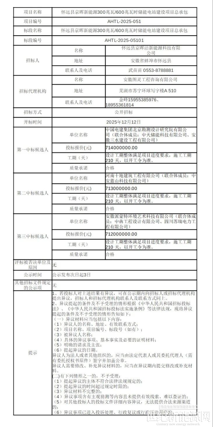 12月13日,懷遠縣京暉新能源300兆瓦/600兆瓦時儲能電站建設項目總承包中標候選人公示。
