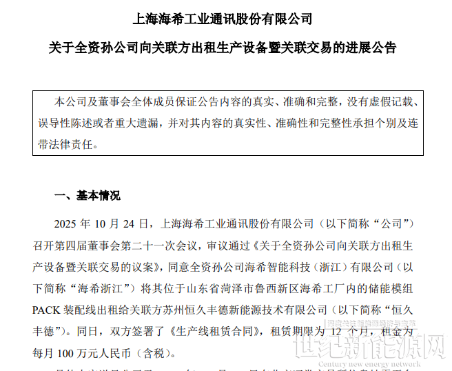 此前披露,2025年10月24日,上海海希工業(yè)通訊股份有限公司審議通過《關(guān)于全資孫公司向關(guān)聯(lián)方出租生產(chǎn)設(shè)備暨關(guān)聯(lián)交易的議案》,同意全資孫公司海海希浙江將其位于山東省菏澤市魯西新區(qū)海希工廠內(nèi)的儲(chǔ)能模組PACK裝配線出租給關(guān)聯(lián)方恒久豐德。同日,雙方簽署了《生產(chǎn)線租賃合同》,租賃期限為12個(gè)月,租金為每月100萬元人民幣(含稅)。