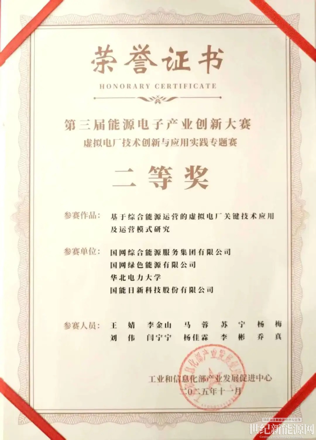 近日,由國網(wǎng)綜能、國網(wǎng)綠色能源、華北電力大學(xué)、國能日新共同打造的參賽項目《基于綜合能源運營的虛擬電廠關(guān)鍵技術(shù)應(yīng)用及運營模式研究》,在工信部主辦的“第三屆能源電子產(chǎn)業(yè)創(chuàng)新大賽虛擬電廠技術(shù)創(chuàng)新與應(yīng)用實踐專題賽”中脫穎而出,成功斬獲二等獎!