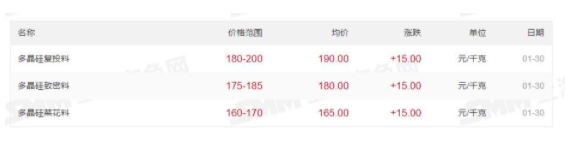 1月30日,上海有色網發布最新硅料價格信息,相較于1月20日的報價,多晶硅復投料、致密料、菜花料均價均上漲15元/kg,目前,復投料最高報價200元/kg,致密料最高報價185元/kg,菜花料最高報價165元/kg。