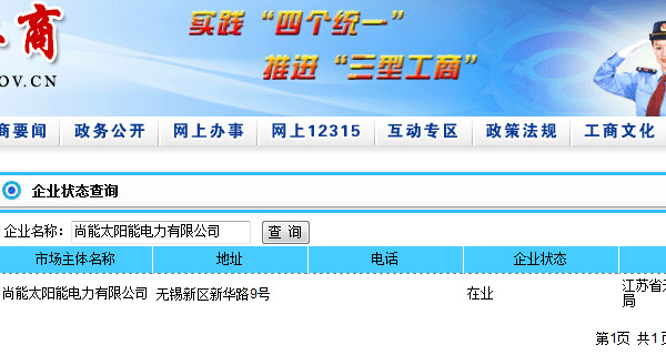 點擊查看:江蘇省工商行政管理局網上查詢結果:尚能太陽能電力有限公司