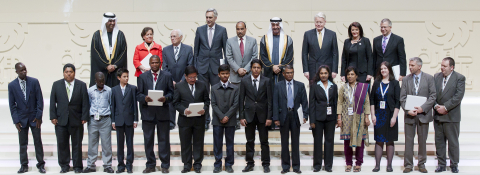 Masdar首席執(zhí)行官兼Abu Dhabi Ports Company董事長Sultan Ahmed Al Jaber博士(后排左一)、毛里塔尼亞總統(tǒng)穆罕默德•烏爾德•阿卜杜勒•阿齊茲(后排左五)、阿布扎比王儲兼阿聯(lián)酋武裝部隊副總司令Sheikh Mohamed bin Zayed Al Nahyan將軍(后排左六)、冰島總統(tǒng)奧拉維爾•拉格納•格里姆松(后排左7)和科索沃總統(tǒng)阿蒂費特•亞希亞加(后排左8)與2013年“扎耶德未來能源獎”獲獎者在阿布扎比的酋長國宮殿酒店的合照(照片:美國商業(yè)資訊)