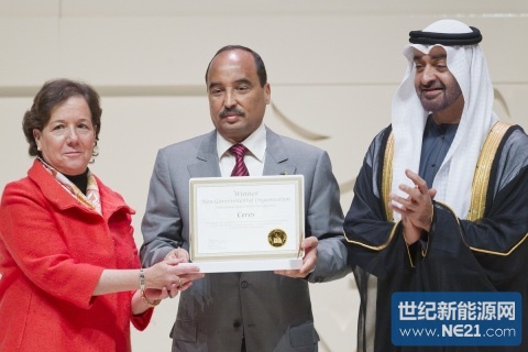 阿布扎比王儲兼阿聯(lián)酋武裝部隊副總司令Sheikh Mohamed bin Zayed Al Nahyan將軍(右一)和毛里塔尼亞總統(tǒng)穆罕默德•烏爾德•阿卜杜勒•阿齊茲(中間)為Ceres首席執(zhí)行官Mindy Lubber(左一)頒發(fā)2013年“扎耶德未來能源獎”非政府組織類獎項(照片:美國商業(yè)資訊)
