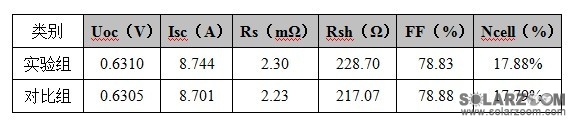 經(jīng)過(guò)制絨后的兩組硅片,正常生產(chǎn)制成電池片,擴(kuò)散同管同舟,刻蝕同設(shè)備,鍍膜同管同舟,印刷同設(shè)備,測(cè)試電池片的電性能數(shù)據(jù)如表一所示:
