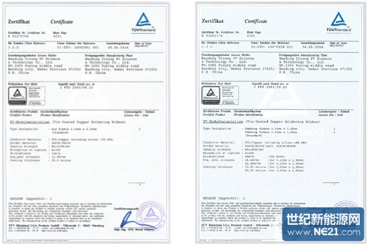 據介紹,該2 Pf G 2363/08.13焊帶、匯流帶認證標準由易通公司與TUV在2012年開始共同制定,是光伏焊帶匯流帶行業的首個產品認證標準,自此結束了光伏焊帶匯流帶沒有統一產品認證標準的歷史,對整體提升國內焊帶匯流帶產品品質提供了參考依據。