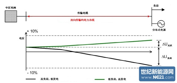 對配網局部電壓穩定的影響。中國早期建設的10kV配電線路多數是單輻射狀分布供電,系統安全性較低。在城區配電網絡建設與改造中逐漸考慮建立環網供電、開環運行的模式。在各種配網結構中,靜態和動態電壓的變化都會對線路保護、系統運行安全造成影響。穩態運行狀態下,電壓理論上沿傳輸線潮流方向逐漸降低。分布式光伏接入后,由于傳輸功率的波動和分布式負荷的特性,使傳輸線各負荷節點處的電壓偏高或偏低,導致電壓偏差超過安全運行的技術指標。圖1中描述了分布式光伏接入配電網對于局部電壓影響的原理,在大規模分布式光伏接入后,配電網局部節點存在靜態電壓偏移的問題。配網中尤其是低壓網絡對電壓變化比較敏感,若想抑制這種影響,需要在中低壓變化器選型中使用可控型變壓器。