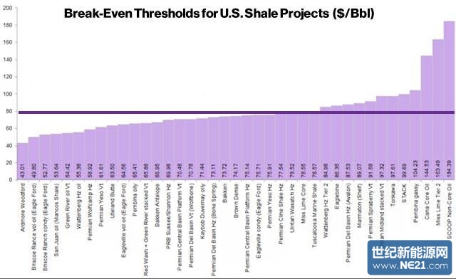也有分析者認(rèn)為,即使油價(jià)跌破80美元/桶,包括Bakken和Eagle Ford這兩大最重要頁巖油產(chǎn)區(qū)在內(nèi)的頁巖油仍然可以實(shí)現(xiàn)盈利,甚至Eagle Ford地區(qū)的部分項(xiàng)目在油價(jià)跌至50美元時(shí)也能盈利。以下是一張頁巖項(xiàng)目的盈虧平衡點(diǎn)示意圖