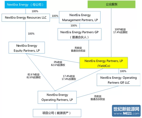在這一架構下,母公司通過作為YieldCo普通合伙人的NextEra Energy Partners GP和擁有YieldCo82.6%投票權的NextEra Energy Equity Partners實現了對YieldCo的控制,同時通過在NextEra Energy Equity Partners中的合伙份額獲得資產82.6%收益。