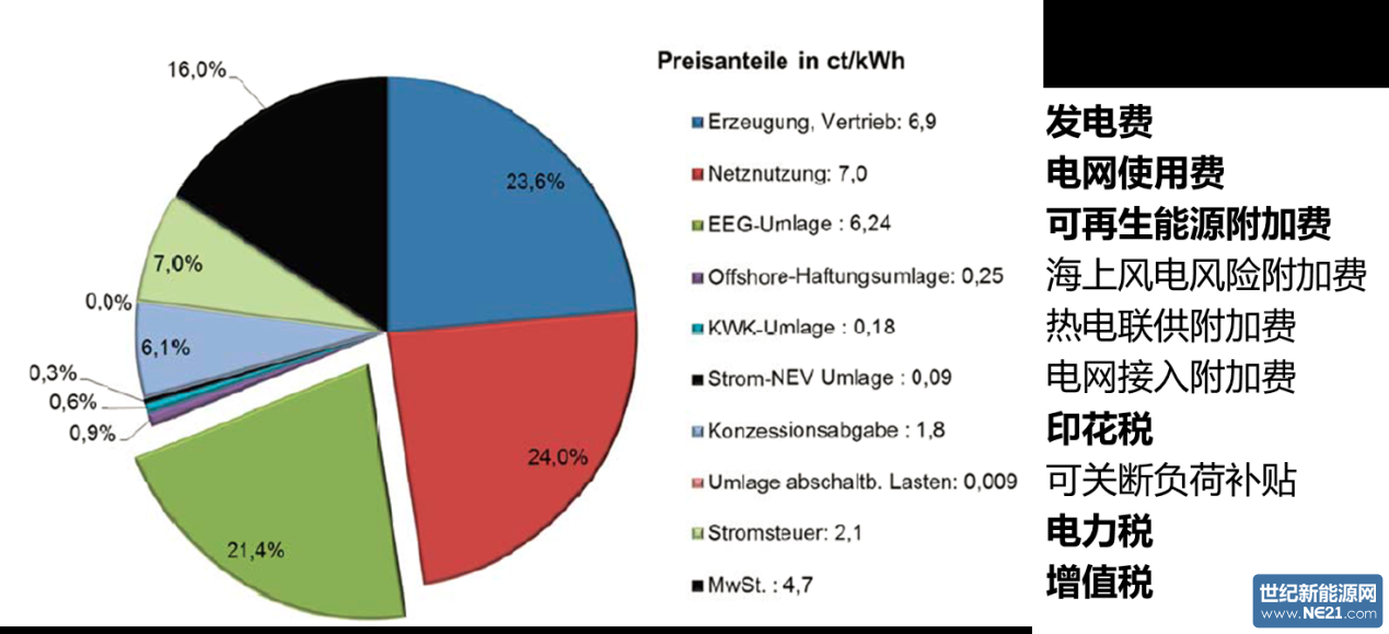 從下圖可以看到德國居民的電費構成中,發電成本占23.6%,而可再生能源附加費是21.4%,與發電成本基本相當。電網使用費用占到24.0%。其余基本是稅,這是德國國家稅收政策的特點,德國給食品補貼、給交通運輸補貼,但不僅不給能源補貼,反而要上稅,上較重的稅。這里要強調的是,可再生能源附加費是會不斷上升的,不會下降,而現在能做到的僅僅是使上升速度有所減緩。