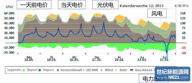 從下面這張圖上就可以看出,風光電出力大的時候,電力市場的售電價格就會下降。2013年3月24日(周日,用電負荷較低)的白天,在光伏發電的高峰,電價甚至成為負的。這就意味著,光伏發電出力越大,賠得就越多。