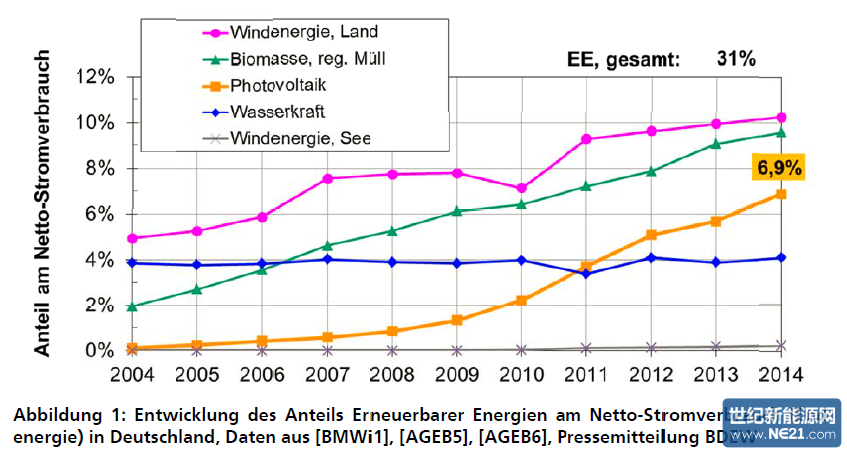 從德國來講,可再生能源的發展從2000年德國能源轉型啟動以來發展得比較好,風電的總發電量占全國電力消費總量已經超過10%左右了,光伏發電的比例也達到了6.9%。