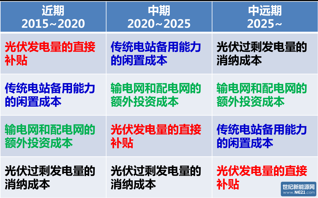 除了對光伏發電的直接補貼成本,還有三項補貼成本在初期的時候很容易被大家忽視,但是和相對固定的補貼不同的是,其它三項補貼成本的金額會隨著時間的推移,在光伏發電功率的比例越來越高時,會越來越多。
