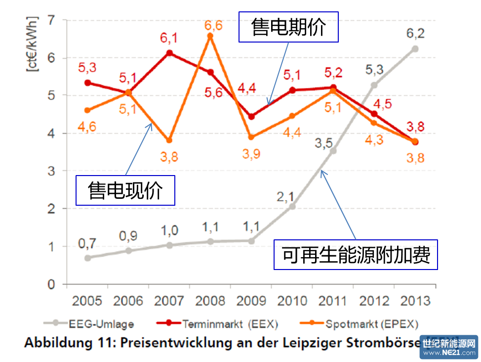 德國現在的電力市場平均交易電價現在只有約3.8歐分,也就是2.8毛或3毛錢,比現在中國的煤電平均上網電價還要低,基本上相當于新疆煤電的水平。但是可再生能源附加費,附加在電力用戶的每一千瓦時的電費上升到了6.2歐分,也就是說發電的市場交易價比可再生能源附加費還要低。