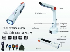 產品介紹: 1.太陽能充電. 2.手搖發電、手搖可給手機及數碼產品充電 3.臺燈. 4.AM/FM. 5.閃燈警報.6.三顆超亮LED照明. 7.電量顯示功能. 產品規格: 1.材質:ABS、PS 2.LED燈的規格:¢5; 15個LED、LED的亮度:2050MCD; 3.電池類型:聚合物鋰電電池 1500mAh 3.7V 4.太陽能板規格128*31MM5.5V 90mA 0.495w充電 5.強光20小時可充滿:a)照明可用32小時 b) 收音機可18小時,c)警報7小時